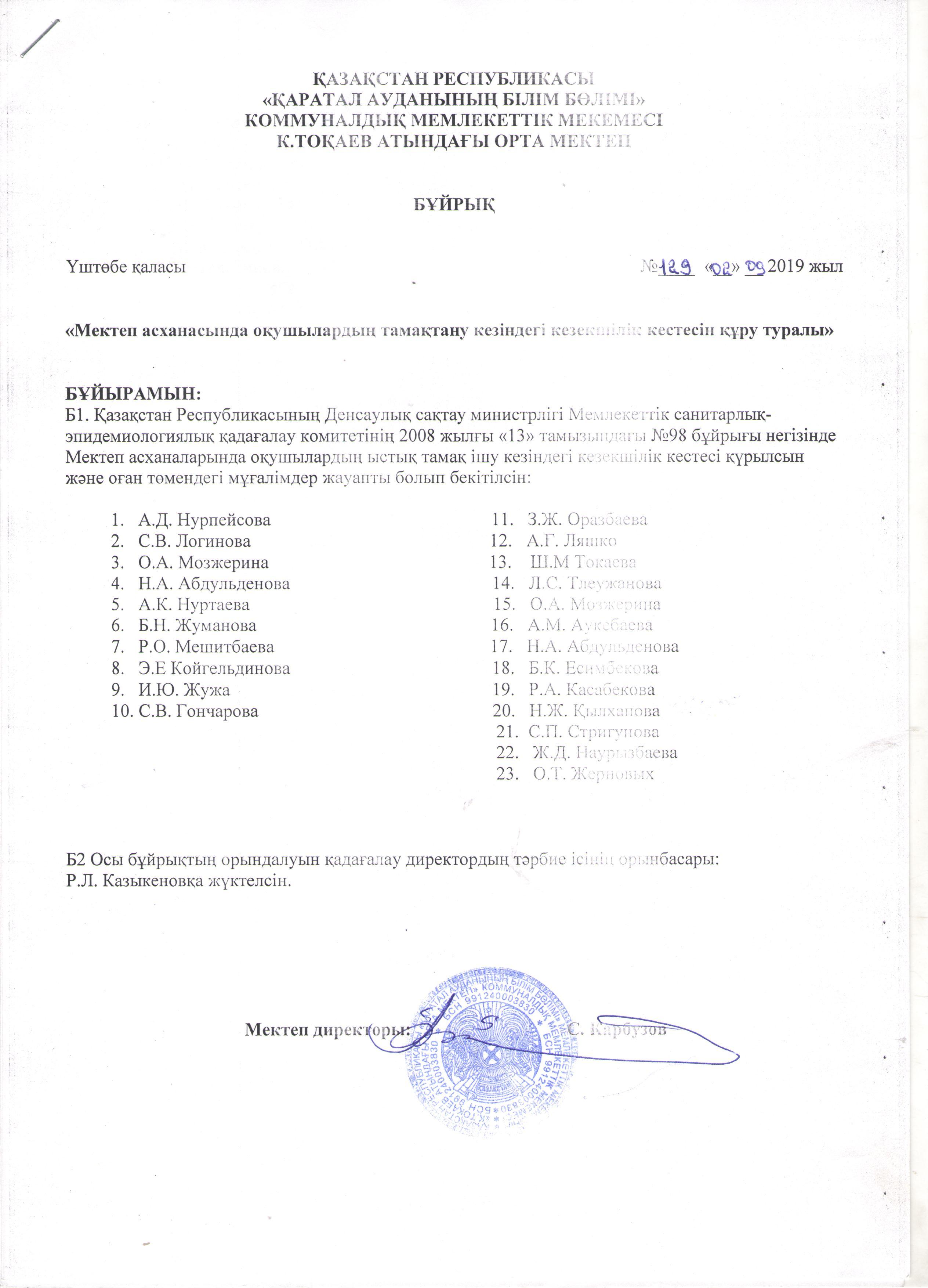 Мектеп асханасында оқушылардың тамақтану кезіндегі кезекшілік кестесін құру туралы бұйрық » К.Тоқаев атындағы орта мектеп